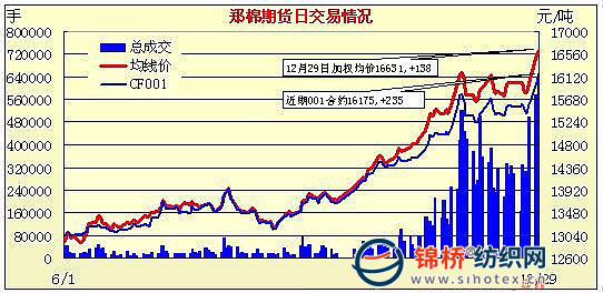 12月29日,鄭棉CF1005合約小幅高開,早盤在多頭買盤推動(dòng)下沖高,午前反復(fù)震蕩,午后多頭買盤推動(dòng)期價(jià)沖高,尾盤受到多頭平倉(cāng)盤打壓下滑,日線高開陰線,主要合約成交量放大,持倉(cāng)量先增后減。CF1005合約日成交584560手,日減倉(cāng)4390手,終盤持倉(cāng)量280598手;CF1009合約日成交51136手,日減倉(cāng)8448手,終盤持倉(cāng)量33790手?;久媲闆r:期貨、撮合雙雙出現(xiàn)大幅上漲,給現(xiàn)貨市場(chǎng)帶來利好。受配額已經(jīng)下發(fā)影響,大多數(shù)紡織企業(yè)進(jìn)貨不積極,部分紡企認(rèn)為外棉價(jià)格過高,多以觀望等待為主。拋儲(chǔ)完成,更提振了棉企囤棉待漲心理,多數(shù)企業(yè)后期價(jià)格看到15500元/噸。