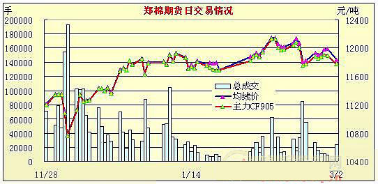 3月2日,鄭棉主力合約CF905小幅低開,早盤空頭賣盤打壓期價下滑,隨后區(qū)間盤整,日線形成中陰線,主要合約成交量較前一日放大,持倉量增加。C905合約日成交18774手,日增倉1738手,終盤持倉量47932手;CF907合約日成交2600手,日減倉34手,終盤持倉量13762手;CF909合約日成交1962手,日增倉402手,終盤持倉量7710手?;久媲闆r:皮棉現貨價格保持平穩(wěn),成交量略有減少。陰雨天氣繼續(xù)影響著南方地區(qū)的籽棉收購,市場成交量依舊不大,價格保持平穩(wěn)。隨著200型棉花企業(yè)開秤數量的增多,籽棉資源日益減少,一些競拍到收儲合同的棉花企業(yè)為了維持籽棉收購量,以便能在規(guī)定的時間內完成收儲合同,幾次提高了籽棉收購價格,目前各地400型加工廠收購籽棉價格在2.5元/斤--2.6元/斤左右。