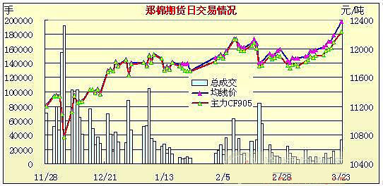 3月23日,鄭棉主力合約小幅高開,早盤主要合約增倉倉上沖,盤中高位震蕩,尾盤略有調(diào)整,日線形成陽線,CF905合約成交溫和放大,持倉略減,CF907合約成交量成倍放大,持倉量大幅增加。C905合約日成交12220手,日減倉386手,終盤持倉量25190手;CF907合約日成交17012手,日增倉4470手,終盤持倉量23352手;CF909合約日成交3158手,日增倉12手,終盤持倉量7362手?;久媲闆r:籽棉資源越來越少,軋花廠停收的越來越多,關(guān)機(jī)的大有人在。棉花價格繼續(xù)保持上漲勢頭,但成交量不大,棉花企業(yè)把棉花買的是高高的,可是成交是很少;紡織廠情況雖說不好,但也是勉強(qiáng)的開著,紗線行情不溫不火,紡織廠為了規(guī)避風(fēng)險,庫存依舊不多。棉花企業(yè)和紡織企業(yè)可謂是攻守雙方一進(jìn)一退,市場被觀望氣氛圍繞,前景不明。