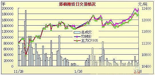 3月26日鄭棉期貨放量上揚(yáng)小幅上漲