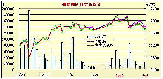 3月3日,鄭棉主力合約CF905小幅低開,盤中在空頭回補(bǔ)支撐下回升,日線形成低開陽線,主要合約成交量較前一日萎縮,持倉量減少。C905合約日成交10356手,日減倉1004手,終盤持倉量46928手;CF907合約日成交1252手,日增倉206手,終盤持倉量13968手;CF909合約日成交1628手,日增倉132手,終盤持倉量7842手?;久媲闆r:南方地區(qū)繼續(xù)持續(xù)陰雨天氣,天氣預(yù)報(bào)顯示這種陰雨天氣有望在本周內(nèi)結(jié)束。部分地區(qū)籽棉收購受降雨天氣影響,成交量不大;沒有受到降雨影響的地區(qū)籽棉收購價(jià)格有小幅上漲,成交量繼續(xù)增加。上周皮棉上漲后,周末價(jià)格維持穩(wěn)定,今日皮棉報(bào)價(jià)有小幅上漲,但漲幅不大。雖然近期市場有上漲跡象,但是200型的小廠仍是不敢多存棉,市場上200型小廠出貨積極。市場上高等級棉較少,一些紡織廠開始在電子盤上提貨。