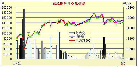 3月9日,鄭棉主力合約CF905平開,午前盤整,午間遠(yuǎn)期合約大幅增倉走高,帶動近月減倉上行,午后重心上移,日線形成陽線,日內(nèi)展期交易活躍,主要合約成交量放大,持倉量近減遠(yuǎn)增。C905合約日成交13202手,日減倉1842手,終盤持倉量42400手;CF907合約日成交5866手,日增倉1972手,終盤持倉量16942手;CF909合約日成交762手,日增倉154手,終盤持倉量8202手?;久媲闆r:南方地區(qū)雨過天晴,棉花加工企業(yè)紛紛抓緊時間收購加工。皮棉銷售活躍,市場成交量較大,倉庫出庫量近幾日都有明顯增加,皮棉主要銷售到江浙和福建等地。相對與南方的火熱銷售,北方棉區(qū)銷售較為平淡,皮棉價格波動不大,成交量也略顯清淡。籽棉收購市場依舊活躍,價格不斷上調(diào),但是加工廠利潤空間縮小,籽棉上調(diào)的幅度不大,同時高等級籽棉和低等級籽棉的收購價格差距越來越大。 3月9日鄭棉期貨成交及持倉排名表 |