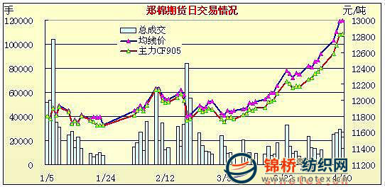4月10日,鄭棉主力合約CF907平開,早盤多頭平倉盤壓力下調(diào)整,隨后多頭買盤推動期價增倉回升,午后一度調(diào)整,尾盤再度收高,日線形成陰線星,主要合約成交量略有下降,近期合約大量減倉,主力合約持倉量變化不大。C905合約日成交2450手,日減倉1124手,終盤持倉量10868手;CF907合約日成交17980手,日增倉18手,終盤持倉量35484手;CF909合約日成交1352手,日增倉120手,終盤持倉量6656手?;久媲闆r:各地有棉花的企業(yè)是越來越少,近兩日內(nèi)地流派的情況仍然較大,一些大廠已紛紛退出了交儲的行列,主要原因是現(xiàn)在籽棉收購價格居高且質(zhì)量有所下降,而收儲要求嚴(yán)格,這加大了企業(yè)加工成本,企業(yè)利潤減少,所以企業(yè)紛紛退出交儲行列。籽棉收購價格仍居高難下,山東一些地區(qū)40衣分的籽棉已經(jīng)賣到了3.1元/斤左右,棉籽價格也在1.05元/斤左右。棉價的上漲,也帶動了棉副產(chǎn)品價格的走高。 |