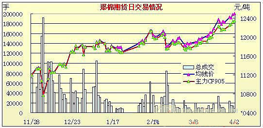 sp; 4月2日,鄭棉主力合約CF907高開,盤中窄幅整理,尾盤在多買集中買盤的推動下迅速沖高,終盤收于日內(nèi)相對高位,日線形成高開小陽線,主要合約成交量萎縮,持倉量小幅增加。C905合約日成交1860手,日減倉570手,終盤持倉量14842手;CF907合約日成交6080手,日增倉802手,終盤持倉量28736手;CF909合約日成交476手,日增倉38手,終盤持倉量5932手。基本面情況:籽棉得到棉副產(chǎn)品支撐價格穩(wěn)定,市場整體變化不大,因為資源減少成交量一般。今日現(xiàn)貨上漲較快,各地棉花均有百余元漲幅,山東一些紡織廠三級棉價格以至12000元/噸一線。主要原因有兩個,一是市場上高等級 棉花較少,一些屯棉的企業(yè)看到棉價上漲,產(chǎn)生了惜售心理,這不得不使紡織廠提價采購;二是紡織企業(yè)庫存較少,補庫意愿有所增強。但是同時 紡織廠 紗線銷售量、價仍不理想,因而紡織廠采購量不是很大。