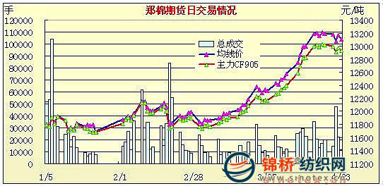 4月23日,鄭棉主力合約CF907高開,早盤震蕩下滑后盤整,午后在空頭賣盤打壓下一度跳水,但很快在多頭買盤支撐下反彈,期價重回盤整區(qū)間內(nèi)震蕩,日線形成高開小陰線,主要合約成交量萎縮,持倉量增加。C905合約日成交228手,日減倉90手,終盤持倉量7280手;CF907合約日成交9916手,日增倉1368手,終盤持倉量44780手;CF909合約日成交850手,日增倉58手,終盤持倉量8192手?;久媲闆r:棉花現(xiàn)貨價格繼續(xù)保持上漲勢頭,但是各地漲幅有所縮小,正三級的棉花站穩(wěn)至13000元/噸一線,四級棉花站上12000元/噸,今日五級棉價格上漲較大,CCIndex527到廠均價為11276,較昨日上漲86元?,F(xiàn)貨市場棉花依然緊俏,但是有資金并大量購棉的紡織廠實屬不多,紡織廠采取隨買隨用的策略,所以皮棉成交價格雖然漲的多,但是成交量不大。許多棉企也逐漸開始轉(zhuǎn)變心態(tài),積極的在現(xiàn)貨上銷售,主要原因還是因為怕國家出臺調(diào)控政策。目前各地春耕工作進(jìn)展順利,預(yù)計制缽的棉區(qū)會在月底到五月初進(jìn)行新棉移栽。 |