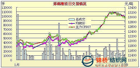 4月29日,鄭棉主力合約CF907平開,早盤空頭賣盤打壓期價(jià)下滑創(chuàng)日低,隨后在空頭短線回補(bǔ)支撐下脫離低點(diǎn)震蕩,午后交投重心略有上移,日線形成小陰線,日內(nèi)成交較前一日有所放大,持倉量少量增加。C905合約日成交654手,日減倉116手,終盤持倉量6664手;CF907合約日成交8860手,日增倉696手,終盤持倉量42424手;CF909合約日成交1944手,日增倉568手,終盤持倉量9284手。 基本面情況:“豬流感”疫情引發(fā)全球的股市、期市一片綠肥紅瘦,農(nóng)產(chǎn)品普遍大跌,電子盤上棉花獨(dú)秀一枝,但棉副方面恐遭變化,人們恐慌疫情的爆發(fā)將抑制飼料需求,所以棉油、棉粕需求回落,價(jià)格有所下調(diào)。皮棉現(xiàn)貨價(jià)格漲幅繼續(xù)放緩,市場上普遍反映近兩日皮棉現(xiàn)貨難有上漲之勢,價(jià)格基本維穩(wěn),實(shí)際成交價(jià)格略有下調(diào)。紡織廠采購依舊低迷,再過兩日就是五一小長假,市場傳聞國家會(huì)在五一之后拋儲(chǔ),所以市場上棉企多積極出貨,紡織廠則觀望居多。 |