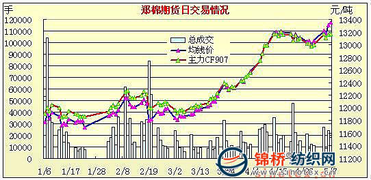 5月7日鄭棉高位整理。CF907以13205元略高開,慣性上摸13220元之后快速回籠,最低下探13130元獲得支持止跌走穩(wěn),尾市略回升,最終報收于13180元。成交量萎縮為6660手,持倉減少966手,余40042手。在前幾個交易日期棉市場多以上漲收盤,6日開盤市場動能顯示不足,低開低走。外圍谷物期貨、原油和美國股市上漲,刺激期棉穩(wěn)住形勢。最終,市場以多跌少漲收盤,收漲/跌幅度不大。基金和投機商買盤活力相比前幾個交易日有所萎縮,市場正等待著美國農(nóng)業(yè)部8日的美棉出口周報和12日將公布的全球棉花供需報告,本月報告中美國農(nóng)業(yè)部將首次公布對09/10年度全球棉花供需預測。