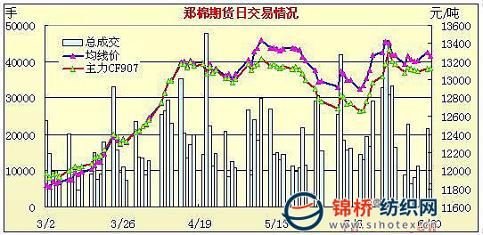 6月30日,鄭棉CF909合約平開(kāi),早盤在多頭平倉(cāng)的壓力下走低,隨后空頭回補(bǔ)支撐期價(jià)止跌反彈,午后增倉(cāng)上沖后回落,日線形成長(zhǎng)2/3下影線的陰線,日內(nèi)成交量萎縮,持倉(cāng)量減少。CF907合約日成交160手,日減倉(cāng)52手,終盤持倉(cāng)量3964手;CF909合約日成交5190手,日減倉(cāng)366手,終盤持倉(cāng)量21864手?;久媲闆r:現(xiàn)貨價(jià)格小幅上漲,但上漲勢(shì)力明顯減弱,一些地區(qū)現(xiàn)貨報(bào)價(jià)以國(guó)儲(chǔ)棉競(jìng)拍價(jià)格為瞻,成交方面依舊冷清,目前紡織廠使用拋儲(chǔ)棉的數(shù)量明顯增加,紡織廠利潤(rùn)微薄但仍在堅(jiān)持開(kāi)機(jī)生產(chǎn),一些中小廠開(kāi)機(jī)率有所下降。上周末相關(guān)部門推出了規(guī)范儲(chǔ)備棉競(jìng)賣交易中代理行為的公告,對(duì)參與競(jìng)拍的企業(yè)給予累計(jì)競(jìng)買國(guó)儲(chǔ)棉數(shù)量的限制,限制標(biāo)準(zhǔn)為企業(yè)4個(gè)月(2009年7月至10月)的最大用棉量。這將會(huì)防止市場(chǎng)上一些企業(yè)借拋儲(chǔ)來(lái)炒高棉價(jià),維護(hù)穩(wěn)定棉紡市場(chǎng)的有序發(fā)展。
