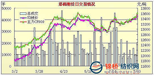 7月10日,鄭棉CF909合約高開,早盤在多頭買盤推動下上沖創(chuàng)日高,隨后平倉盤打壓期價(jià)回落,短線形成盤跌格局,終盤收于日內(nèi)相對低位,日線形成長上影線的星線,日內(nèi)成交量微幅放大,持倉量增加;CF1001合約早盤高開后多頭買盤推動期價(jià)上行,交投重心上移,日線形成中陽線,盤中成交量放大,持倉大幅增加。CF909合約日成交9588手,日增倉520手,終盤持倉量25476手;CF1001合約日成交9236手,日增倉3252手,終盤持倉量15798手?;久媲闆r: 現(xiàn)貨價(jià)格及本保持穩(wěn)定,現(xiàn)貨上地產(chǎn)棉已是難見,只有一些新疆棉,價(jià)格較高,讓一些中小型紡織廠望而卻步。從昨日競拍的情況上看,08年度收儲棉的價(jià)格仍在上漲,一些紡織廠反映目前內(nèi)地庫點(diǎn)競拍激烈,使得競拍價(jià)格較高,紡織廠一直處于資金緊張的情況,所以對這一價(jià)格難以接受,但是為了保證生產(chǎn),不停機(jī),也是無耐選擇。企業(yè)建議增加內(nèi)地庫點(diǎn)日拋儲數(shù)量,減少因競爭而引起的棉價(jià)居高。美國農(nóng)業(yè)部報(bào)告,6.26-7.2一周美國凈簽約出口本年度陸地棉10591噸,較前一周減70%,較近四周平均值減68%;裝運(yùn)74185噸,較前周減2%,但較近四周平均值增4%。凈簽約出口本年度皮馬棉907噸,較前一周減49%,較近四周平均值減56%;裝運(yùn)2268噸。09/10年度陸地棉凈簽約出口7734噸,下年度皮馬棉凈簽約出口295噸。當(dāng)周中國凈簽約進(jìn)口本年度陸地棉僅816噸,裝運(yùn)陸地棉14061噸。凈簽約下年度皮馬棉635噸。