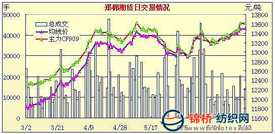 7月13日,鄭棉CF909合約高開,早盤在多頭逢高回吐的打壓下調(diào)整,隨后多頭買盤跟進推動期價揚升,盤中高位震蕩,日線形成長上陽線星,日內(nèi)成交量萎縮,持倉量小幅增加;CF1001合約早盤空頭賣盤打壓期價調(diào)整,盤中低位受到承接買盤支撐回升,盤中低位震蕩,日線形成高開小陰線,盤中成交量萎縮,持倉大幅增加。CF909合約日成交6458手,日增倉334手,終盤持倉量25810手;CF1001合約日成交6388手,日增倉1740手,終盤持倉量17538手。基本面情況:現(xiàn)貨價格繼續(xù)保持上漲行情,市場上成交清淡,由于價格較高無人問津。儲備棉競拍從昨日開始調(diào)整了時間并加大了競拍的數(shù)量,陳棉數(shù)量有所增加,占到了當(dāng)日競拍數(shù)量的一半,受拋儲放量影響,競拍價格走低。據(jù)近期到紡織廠調(diào)研顯示,目前紡織廠紗線庫存較少,維持在15天左右,但是棉布庫存較大,同時由于棉價居高,紡織廠均不同程度的減少了棉花的用量,紡滌綸較多。隨著國家對日儲備棉數(shù)量的放大,或會使得棉價回到合理區(qū)間。 |