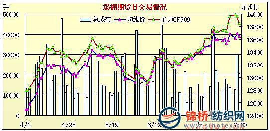 7月29日,鄭棉CF909合約低開后在空頭回補(bǔ)支撐下反彈,盤中區(qū)間減倉盤整,日線形成陽線,日內(nèi)成交量變化不大,持倉量大幅減少;CF1001合約早盤大幅震蕩創(chuàng)日低,隨后多頭買盤支撐期價(jià)反抽,盤中高位盤整,尾盤在平倉盤打壓下收弱,日線形成陰線星,日內(nèi)成交量萎縮,持倉量減少。CF909合約日成交4320手,日減倉3706手,終盤持倉量13758手;CF1001合約日成交7788手,日減倉666手,終盤持倉量33360手。基本面情況:現(xiàn)貨價(jià)格有小幅上漲,棉商也隨之調(diào)高價(jià)格,但是成交不旺。從競拍情況上看,新疆棉占到當(dāng)日成交比例的較大部分,競拍價(jià)格也較內(nèi)地低很多,但是由于中小企業(yè)資金問題和新疆棉出疆問題使得中小紡織無法從中得到實(shí)惠,觀望氣氛濃厚。一些紡織大廠有選擇的在內(nèi)地和新疆庫點(diǎn)競拍棉花,目前庫存較為充足。