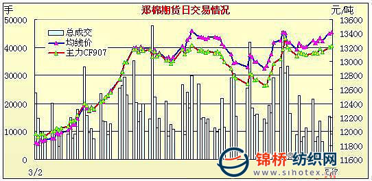 bsp; 7月7日鄭棉CF909合約高開,早盤在多頭買盤推動(dòng)下沖高,午前區(qū)間盤整,午后多頭買盤推動(dòng)期價(jià)走高,交投重心隨之小幅上移,日線形成小陽(yáng)線,日內(nèi)成交量萎縮,持倉(cāng)量增加。CF909合約日成交7632手,日增倉(cāng)552手,終盤持倉(cāng)量22656手;CF1001合約日成交1066手,日增倉(cāng)238手,終盤持倉(cāng)量12216手?;久媲闆r:現(xiàn)貨價(jià)格繼續(xù)穩(wěn)中上漲,成交方面依舊冷清,市場(chǎng)上紡織廠壓力較大,即使銷售順暢,但是利潤(rùn)微薄,同時(shí)棉價(jià)居高也是 紡織廠不能承受的,另?yè)?jù)企業(yè)反映,儲(chǔ)備棉出庫(kù)仍較慢,這主要是因?yàn)閭€(gè)別庫(kù)出庫(kù)較為集中影響。在最近對(duì) 棉花企業(yè)的調(diào)查情況上看,企業(yè)資金問題都較好,400型的大廠參與了去年的收儲(chǔ)計(jì)劃,所以還貸情況良好。天氣情況越來越受人們關(guān)注,原因是在全國(guó)植棉面積減少的情況下,新棉的產(chǎn)量關(guān)系到了新棉上市價(jià)格的走勢(shì)。