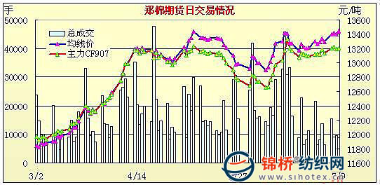 7月9日,鄭棉CF909合約低開(kāi),早盤在多頭平倉(cāng)的打壓下慣性下探創(chuàng)日低,隨后空頭回補(bǔ)支撐期價(jià)回穩(wěn)震蕩,午前多頭增倉(cāng)拉動(dòng)期價(jià)上行,午后重心上移,尾盤加速?zèng)_高,日線形成1/2下影線的陽(yáng)線,日內(nèi)成交量變化不大,持倉(cāng)大量增加。CF909合約日成交7398手,日增倉(cāng)1822手,終盤持倉(cāng)量24956手;CF1001合約日成交1036手,日增倉(cāng)390手,終盤持倉(cāng)量12546手?;久媲闆r:現(xiàn)貨價(jià)格繼續(xù)保持上漲,從昨日儲(chǔ)備棉競(jìng)拍的情況上看市場(chǎng)上低等級(jí)棉價(jià)格提高,由于目前是紡織淡季,而棉花價(jià)格持續(xù)走高,使得一些紡織廠降低了配棉比,同時(shí)一些中小紡織廠轉(zhuǎn)向滌棉、滌粘混紡的生產(chǎn),來(lái)降低棉花的使用量。同時(shí)受內(nèi)地庫(kù)點(diǎn)競(jìng)拍數(shù)量較少,競(jìng)拍激烈,價(jià)格較高影響,一些不急著用棉的企業(yè)開(kāi)始選擇西部地區(qū)的新疆、甘肅庫(kù)點(diǎn)。據(jù)了解目前新疆、甘肅庫(kù)點(diǎn),競(jìng)拍人數(shù)較少,競(jìng)拍價(jià)格較內(nèi)地偏低,同時(shí)質(zhì)量也較好,除去運(yùn)輸費(fèi)用和運(yùn)輸時(shí)間較內(nèi)地略高外,其性價(jià)比是較高的。