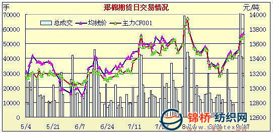 9月17日,鄭棉CF1001合約高開,早盤反復(fù)震蕩后調(diào)整,午前兩度探低,午后在空頭回補(bǔ)與多頭買盤的共同推動(dòng)下沖高,尾盤中幅調(diào)整,日線形成高開陽線,主要合約成交量萎縮,持倉量小幅增加。CF1001合約日成交24168手,日增倉892手,終盤持倉量49500手;CF1005合約日成交3594手,日增倉430手,終盤持倉量10992手。基本面情況:主產(chǎn)棉區(qū)天氣漸轉(zhuǎn)晴,籽棉采摘量上升。棉企因收購成本過高,收購不積極,部分企業(yè)停收。新棉到廠價(jià)四級(jí)在12600元/噸,新棉在13000元/噸左右,與當(dāng)前競(jìng)拍價(jià)格相當(dāng)。紡織企業(yè)觀望采購居多,都在等待購買中期花。市場(chǎng)上高等級(jí)棉稀缺,紡企只得選擇高價(jià)競(jìng)拍國儲(chǔ)新疆棉。