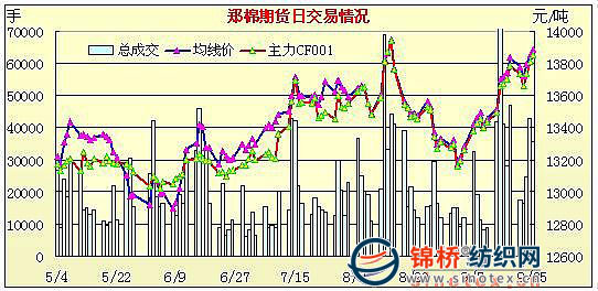 9月25日,鄭棉CF1001合約低開,早盤在多頭平倉打壓下調(diào)整后低位整理,午后多頭買盤支撐期價走高,盤中高位成交量放大,尾盤在平倉盤的壓制下收低,日線形成低開小陰線,主要合約成交量萎縮,持倉量下降。CF1001合約日成交31600手,日減倉2316手,終盤持倉量51392手;CF1005合約日成交3750手,日增倉432手,終盤持倉量12824手?;久媲闆r:節(jié)日日漸臨近,紡企采購積極性也漸有提高。拋儲加量后,仍全部成交,競拍價格出現(xiàn)連續(xù)上漲。現(xiàn)貨市場皮棉成交也顯活躍,價格繼續(xù)小幅上漲,新棉到廠在13000-13200元/噸。200型企業(yè)薄利多銷,收購積極。棉農(nóng)惜售心理較強(qiáng),收購仍難以上量。近幾日棉籽波動較大,棉企快加工快出售。山東天氣放晴,開秤收購企業(yè)陸續(xù)增多,棉企多跨地區(qū)收購。