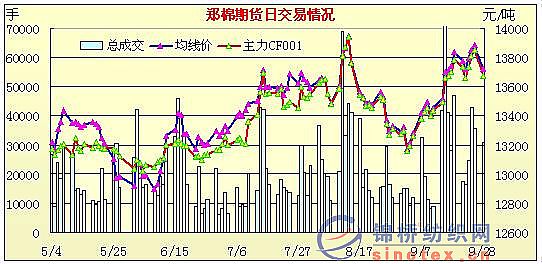 9月28日,鄭棉CF1001合約大幅低開,早盤一度在空頭回補支撐下反彈后多頭平倉盤集中涌入,打壓期價盤跌,午后創(chuàng)日低觸及中線支撐位后受到空頭回補支撐反彈,日線形成低開中陰線,主要合約成交量萎縮,持倉量大幅下降。CF1001合約日成交26288手,日減倉8210手,終盤持倉量43182手;CF1005合約日成交3884手,日減倉732手,終盤持倉量12092手?;久媲闆r:近日,我國南部產(chǎn)棉區(qū)又遇陰雨天氣,尤其是湖北、江蘇、安徽等地,對中期花的質(zhì)量造成一定影響。致使加工廠及棉農(nóng)均看好后市,加工廠收購積極,籽棉價格今日大幅上漲。截止目前,湖北荊州、湖南常德等地加工廠均反映新棉衣分較低,目前35-36%的居多。也有部分加工廠因為棉花收購成本增高,銷售基本無利潤停收,節(jié)前棉花企業(yè)出貨也較為積極,現(xiàn)貨到廠略有上漲,在12800-13100元/噸。