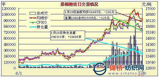 1月20日,鄭棉主要合約開盤后在多頭平倉盤與空頭賣盤壓制下探盤整,隨后空頭增倉打壓期價下滑,午后重心下移盤整,尾盤放量收低,主要合約日線形成中陰線,日內(nèi)成交量放大,持倉量增加。CF1005合約日成交38856手,日增倉3768手,終盤持倉量122162手;CF1009合約日成交196942手,日增倉12016手,終盤持倉量142062手?;久媲闆r:現(xiàn)貨市場保持平穩(wěn)。大部分棉花企業(yè)存棉為四級,紡織企業(yè)采購三級棉較為困難。進口棉相比地產(chǎn)棉優(yōu)勢顯現(xiàn),價格質(zhì)量較合乎紡企需求,目前占領(lǐng)了部分國內(nèi)棉花市場,交易較為活躍。據(jù)紡織企業(yè)反映,新疆棉運往內(nèi)地情況不見好轉(zhuǎn),鐵路已經(jīng)批下計劃的車皮,許多發(fā)運站迭加起來到內(nèi)地站,每天只有兩個車皮,運輸較為緩慢。