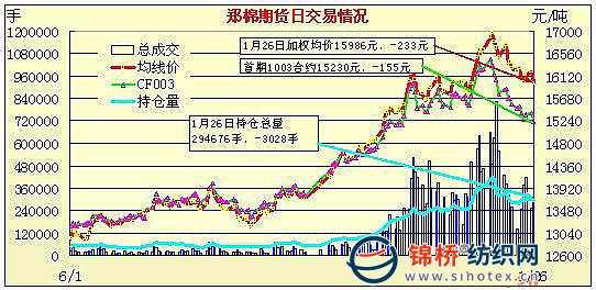 1月26日,鄭棉主要合約低開,早盤在平倉盤的壓力下調(diào)整,此后形成弱市橫向盤整,盤中抽象手量較大,午后空頭發(fā)力打壓期價(jià)下破盤整區(qū)間,CF1005合約受空頭打壓增倉下跌,CF1009合約在多頭止損盤作用下減倉走低,終盤收于日低點(diǎn)一線,主要合約日線形成低開陰線,日內(nèi)成交量溫和放大,近月持倉量增加,遠(yuǎn)期合約持倉量略減。CF1005合約日成交32020手,日增倉3162手,終盤持倉量109928手;CF1009合約日成交270770手,日減倉6674手,終盤持倉量148970手?;久媲闆r:春節(jié)臨近,紡企采購意愿增強(qiáng),報(bào)價(jià)保持平穩(wěn)。棉企選擇出售低等級棉,庫存高等棉?,F(xiàn)貨三級成交價(jià)格在14900-15000元/噸,大廠庫存較充裕,不急于補(bǔ)充庫存,看穩(wěn)年前棉花市場。新疆受大雪影響,鐵路運(yùn)輸以能源為主,棉花運(yùn)輸仍未得到好轉(zhuǎn)。