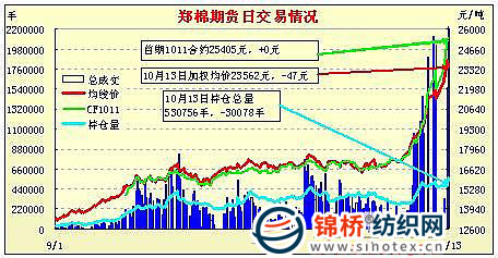 10月13日,鄭棉CF1105合約平開,早盤沖高調(diào)整,大幅震蕩創(chuàng)日低,隨后在多頭逢低買盤支撐下回穩(wěn),空頭回補(bǔ)支撐期價(jià)午后盤整,尾盤在空頭集中回補(bǔ)的推動(dòng)下收強(qiáng),日線形成陽(yáng)線星,日內(nèi)成交量萎縮,持倉(cāng)量大幅減少。CF1101合約日成交178300手,日增倉(cāng)6796手,終盤持倉(cāng)量97020手;CF1105合約日成交1676282手,日減倉(cāng)42052手,終盤持倉(cāng)量383834手。基本面情況:現(xiàn)貨市場(chǎng)穩(wěn)中續(xù)漲,成交仍不多。受棉籽不斷上調(diào)影響,籽棉價(jià)格繼續(xù)攀高,棉企為吸引資源,繼續(xù)高價(jià)收購(gòu)。山東籽棉普遍上升到5.7-5.8元/斤,其它省份略低。由于籽棉連續(xù)上調(diào),籽棉中間商活躍。大部分棉花企業(yè)堅(jiān)持快購(gòu)快銷,部分企業(yè)顧及風(fēng)險(xiǎn)暫停收購(gòu)。棉企加工出的較好皮棉,多為好四級(jí),銷售報(bào)價(jià)24000-25000元/噸,購(gòu)銷雙方不積極,多觀望。