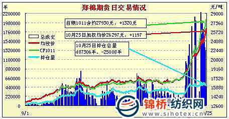 10月25日,上周五紐期上漲,影響今日鄭棉CF1105合約大幅高開,早盤在空頭回補買盤推動下沖高,隨后少量平倉盤打壓下調(diào)整,盤中低增量回升,空頭恐慌止損買盤令期價封于漲停,日線形成高開陽線,日內(nèi)成交量萎縮,持倉量減少。CF1101合約日成交69668手,日減倉3166手,終盤持倉量66774手;CF1105合約日成交337860手,日減倉15698手,終盤持倉量327596手。基本面情況:100萬噸儲備棉投放正式結束,大部分紡織企業(yè)都競拍到一定庫存,大型紡織企業(yè)庫存較充裕,進貨意愿不強。只有部分小型紡織企業(yè)隨用隨買,因此,現(xiàn)貨市場成交仍一般,紡織企業(yè)認為當前價格較高,而且新棉多以四級及好四級為主,三級棉很少。成交現(xiàn)貨四級提貨價在25200元/噸,好四級25600元/噸。棉農(nóng)囤棉較多,加工廠收購緩慢。