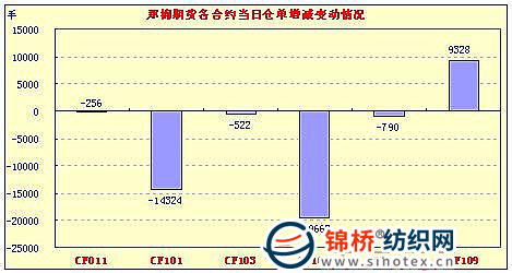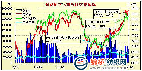 10月26日,周一紐期繼續(xù)上漲,影響今日鄭棉CF1105合約大幅高開(kāi),早盤(pán)沖高后在短線平倉(cāng)盤(pán)的壓制下回落盤(pán)整,尾盤(pán)下探后在低位承接買(mǎi)盤(pán)的支撐下反抽,日線形成高開(kāi)陰線星,日內(nèi)成交量放大,持倉(cāng)量減少。CF1101合約日成交65762手,日減倉(cāng)14324手,終盤(pán)持倉(cāng)量52450手;CF1105合約日成交1143654手,日減倉(cāng)19662手,終盤(pán)持倉(cāng)量307934手?;久媲闆r:現(xiàn)貨價(jià)格周末加速上漲。某大型紡企三級(jí)棉到廠價(jià)漲到26800元/噸。大部分紡織廠較為嘩然,采購(gòu)緩慢。棉企停收增多,籽棉價(jià)格大部分地區(qū)突破6元/斤,加工出的棉花品級(jí)仍以四級(jí)為主。棉籽價(jià)格堅(jiān)挺延續(xù)上漲,支撐籽棉價(jià)格上行。下游棉紗市場(chǎng)總體平穩(wěn),價(jià)格堅(jiān)挺。