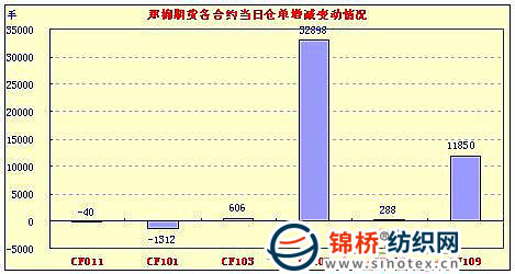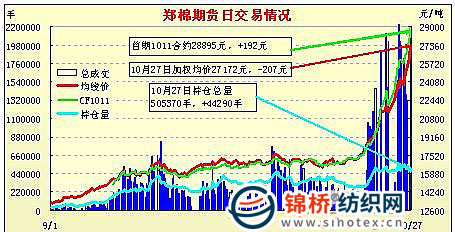 10月27日,周二紐期繼續(xù)上漲,影響今日鄭棉CF1105合約高開,早盤在空頭賣盤打壓下走低,隨后多頭支撐期價(jià)反抽,此后在平倉盤和空頭賣盤的壓制下盤跌,日線形成高開長陰線,日內(nèi)成交量放大,持倉量增加。CF1101合約日成交37450手,日減倉1312手,終盤持倉量51138手;CF1105合約日成交1726012手,日增倉32898手,終盤持倉量340832手?;久媲闆r:近兩日部分棉區(qū)天氣對棉花生產(chǎn)有所不利,陸續(xù)有內(nèi)地棉區(qū)籽棉收購價(jià)格突破6元/斤,受油料市場上漲影響,棉籽價(jià)格也突破了2元/斤,棉短絨價(jià)格均在萬元以上。目前收購市場上,部分廠家比較謹(jǐn)慎,收購籽棉雖然衣分不是很高,但是水分控制很好,水分過高就停止收購,但是也有部分加工廠不挑衣分水分,全都收購,使得當(dāng)?shù)厥召徥袌霰容^混亂。