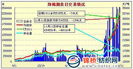 11月11日,鄭棉主要合約低開,早盤空頭回補(bǔ)支撐期價反彈,隨后多頭平倉盤打壓期價直線下行封住跌停,日線形成低開陰線,日內(nèi)成交量萎縮,持倉量減少。CF1105合約日成交247574手,日減倉26822手,終盤持倉量266612手;CF1109合約日成交245368手,日減倉18238手,終盤持倉量133934手?;久媲闆r:現(xiàn)貨報價繼續(xù)上調(diào),部分企業(yè)出貨報價與期貨價格相當(dāng)。新疆棉站臺價維持平穩(wěn),提貨31500元/噸。棉企收購籽棉積極,收購量再減,價格繼續(xù)上漲,山東、河北個別地區(qū)加工廠收購最高價格達(dá)到7.3-7.4元/斤,加工皮棉成本到30000元/噸以上。各地采摘基本進(jìn)入尾聲,棉農(nóng)交售價格多在6-6.5元/斤,依然惜售。