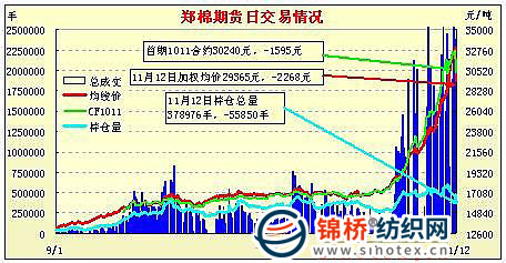 11月12日,鄭棉主要合約低開,盤中在多頭集中平倉的打壓下封于跌停,日線形成低開小陰線,日內(nèi)成交量急劇萎縮,持倉量減少。CF1105合約日成交85144手,日減倉46058手,終盤持倉量220554手;CF1109合約日成交58910手,日減倉8664手,終盤持倉量125270手?;久媲闆r:山東某大型紡織企業(yè)到廠價(jià)下調(diào)200元/噸,三級棉到廠31300元/噸,而且檢驗(yàn)較前幾日嚴(yán)格。幾家大型外商也相應(yīng)下調(diào)皮棉收購價(jià)格,加工廠囤棉信心動搖,銷售意愿較強(qiáng),到紡企交售增多。受皮棉價(jià)格下調(diào)影響,加工廠籽棉收購價(jià)格下調(diào),部分加工廠暫停收購。