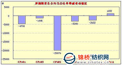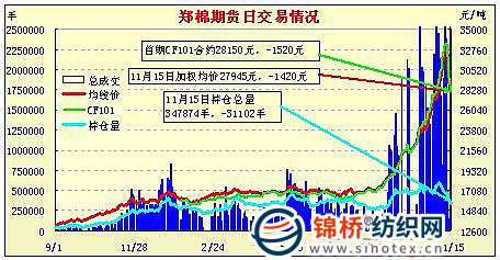 11月15日,鄭棉主要合約低開,早盤在空頭回補(bǔ)的支撐下反抽,盤中橫向整理增倉,午后下滑,尾盤在多頭買盤支撐下回穩(wěn),日線形成低開陽線,日內(nèi)成交量放大,持倉量減少。CF1105合約日成交1421862手,日減倉20076手,終盤持倉量200478手;CF1109合約日成交1057090手,日減倉2632手,終盤持倉量122638手?;久媲闆r:現(xiàn)貨市場出貨明顯增多,一些小的加工廠開始降價(jià)出貨,市場看跌氣氛較大。籽棉收購價(jià)格大幅回落,一天之內(nèi)部分棉區(qū)籽棉價(jià)格下壓0.5元/斤之多,往日只有幾千斤的收購量,這兩日猛增至幾萬斤,軋花廠門口也排起了長隊(duì)。
