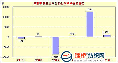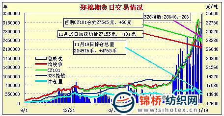11月19日,鄭棉主要合約在高開(kāi),早盤(pán)在空頭賣(mài)盤(pán)打壓下走低,午后期價(jià)創(chuàng)日低后低位換手量加大,隨后在空頭回補(bǔ)的推動(dòng)下脫離低點(diǎn)回升,日線形成高開(kāi)1/2下影線的陰線,日內(nèi)成交量放大,遠(yuǎn)期合約持倉(cāng)量增加。CF1105合約日成交1942408手,日減倉(cāng)8530手,終盤(pán)持倉(cāng)量185474手;CF1109合約日成交1469550手,日增倉(cāng)12468手,終盤(pán)持倉(cāng)量138570手?;久媲闆r:山東某大型棉企再次下調(diào)皮棉收購(gòu)價(jià)格,每噸下調(diào)500元,前往交售的車(chē)輛從昨天即多起來(lái),一天有一百來(lái)輛車(chē)前往交售,四級(jí)成交價(jià)格在27500元-27900元/噸。棉花加工企業(yè)收購(gòu)幾近停止,有價(jià)無(wú)市,一般掛四級(jí)價(jià)格5.8-6元/斤,但交售的寥寥無(wú)幾,只有棉販較為著急,部分加工廠日收購(gòu)量幾乎為零,較大的加工廠收購(gòu)量由之前的每日十幾萬(wàn)斤,降到幾千斤。今日新疆棉站臺(tái)提貨價(jià)毛重30000元/噸。下游紗線報(bào)價(jià)混亂,銷(xiāo)售困難。