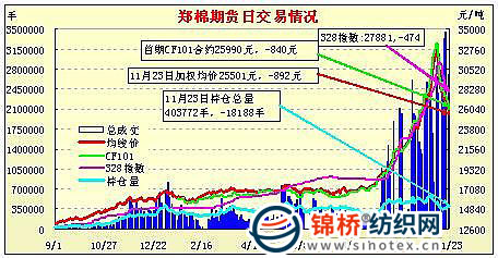 11月23日,鄭棉主要合約小幅高開,早盤反復(fù)震蕩,隨后在空頭賣盤打壓下迅速跳水,盤中震蕩下行,午后空頭回補支撐期價反彈,但是多頭止損賣盤抑制期價反彈幅度,日線形成陰線,日內(nèi)近月成交量萎縮,遠月成交放量,持倉量先增后減。CF1105合約日成交1385094手,日減倉9584手,終盤持倉量205348手;CF1109合約日成交1290718手,日減倉8716手,終盤持倉量165802手?;久媲闆r:棉企多有部分存棉,價格下跌之快令棉企較為驚慌,出貨積極,幾家大型棉商為急于出貨,報價則是更低。但截止目前,大部分企業(yè)已出現(xiàn)銷售倒掛。堅持收購的企業(yè)已經(jīng)很少,并且收購價格大幅下跌,已普遍下調(diào)至6元/斤以下。棉副各品種也相應(yīng)出現(xiàn)大幅下跌。