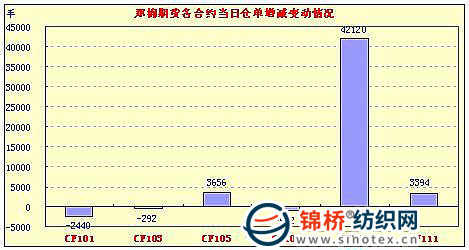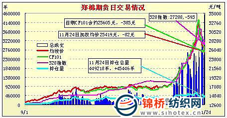 11月24日,鄭棉主要合約小幅低開,早盤在多頭買盤推動(dòng)下沖高,午間創(chuàng)日高后在空頭打壓下回落,尾盤近月合約受到空頭回補(bǔ)支撐回升,帶動(dòng)遠(yuǎn)月回升,日線形成陽線,日內(nèi)近月成交量放大,遠(yuǎn)月成交放天量,持倉量增加。CF1105合約日成交1861390手,日增倉3656手,終盤持倉量209004手;CF1109合約日成交2631106手,日增倉42120手,終盤持倉量207922手?;久媲闆r:現(xiàn)貨市場(chǎng)加工廠出貨仍顯積極,價(jià)格繼續(xù)下滑。據(jù)了解,山東某大型紡企昨日再次下調(diào)皮棉收購價(jià)格,三級(jí)棉報(bào)到廠價(jià)27000元/噸,四級(jí)26600元/噸,仍有加工廠前往交售。加工廠銷售倒掛,部分棉企開始惜售,停止籽棉收購,收購市場(chǎng)處于有價(jià)無市狀態(tài),籽棉價(jià)格維持在5.5-5.8元/斤左右。