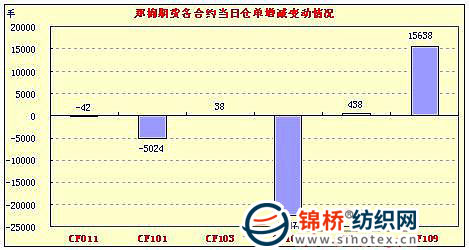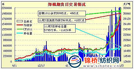11月3日,鄭棉主要合約平開(kāi),CF1105合約早盤(pán)在多頭推動(dòng)下上行,隨后空頭回補(bǔ)買(mǎi)盤(pán)助推價(jià)價(jià)格上漲,午后形成盤(pán)整平臺(tái)并下調(diào)整理,日線形成高開(kāi)陽(yáng)線星;CF1109合約在多頭推動(dòng)下走高,午后空頭賣(mài)盤(pán)壓制期價(jià)下滑,日線形成小陽(yáng)線,連續(xù)三個(gè)交易日漲2445元;日內(nèi)成交量萎縮,持倉(cāng)量近減遠(yuǎn)增。CF1105合約日成交1457718手,日減倉(cāng)22472手,終盤(pán)持倉(cāng)量346260手;CF1109合約日成交608744手,日增倉(cāng)15638手,終盤(pán)持倉(cāng)量185118手?;久媲闆r:國(guó)內(nèi)棉花現(xiàn)貨市場(chǎng)保持上行之勢(shì),一方面國(guó)內(nèi)外電子盤(pán)棉花行情續(xù)漲對(duì)現(xiàn)貨行情有刺激作用,另一方面,目前市場(chǎng)上可收購(gòu)的籽棉資源不多,而且棉農(nóng)多看好后市,交售熱情不高,部分中小企業(yè)已經(jīng)停收,而仍處于加工狀態(tài)的企業(yè)為了確保經(jīng)營(yíng)則處于激烈的競(jìng)爭(zhēng)環(huán)境中,收購(gòu)價(jià)格不斷提高,河北、山東等地弱三級(jí)棉花價(jià)格普遍已經(jīng)達(dá)到6.3-6.4元/斤,成本壓力也決定了皮棉行情的強(qiáng)勢(shì)。