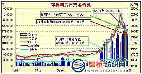 11月30日,鄭棉主要合約平開,早盤在空頭打壓下回落盤整,午后多頭止損盤壓制期價走低,隨后多頭買盤集中涌入,推動期價直線沖高,日線形成長下影線的陽線,日內(nèi)近月成交量放大,持倉量近減遠增。CF1105合約日成交352660手,日減倉4960手,終盤持倉量147886手;CF1109合約日成交2228102手,日增倉28108手,終盤持倉量246558手。基本面情況:現(xiàn)貨市場部分紡織企略有采購意愿,有小批量采購,但棉企惜售情緒較強,市場成交仍稀少。當前棉企銷售價格均已倒掛,加工廠收購量相當少,收購量多的每天也只有百來斤,購銷仍處于僵持局面。籽棉價格多以跌破5元/斤,市場交售普遍以四級為主,基本已無三級。