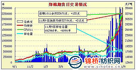11月9日,鄭棉主要合約開盤后在空頭打壓下迅速下跌,隨后空頭回被推動(dòng)期價(jià)自低位反轉(zhuǎn)回升震蕩,午后震蕩幅度加大,日線形成長(zhǎng)下影線的星線,日內(nèi)成交量放大,遠(yuǎn)期合約成交量創(chuàng)上市以來新高,持倉(cāng)量變化不大。CF1105合約日成交1694108手,日減倉(cāng)5022手,終盤持倉(cāng)量292994手;CF1109合約日成交931172手,日減倉(cāng)7304手,終盤持倉(cāng)量135224手?;久媲闆r:企業(yè)收購(gòu)積極,籽棉價(jià)格突破7元/斤,山東最高價(jià)格已到7.1元/斤,各地區(qū)收購(gòu)價(jià)格普遍到6.8元/斤左右,棉籽突破2.1元/斤,棉企加工成本達(dá)到29000-30000元/噸。部分紡企采購(gòu)積極,但成交量很少,棉企多囤棉惜售。
