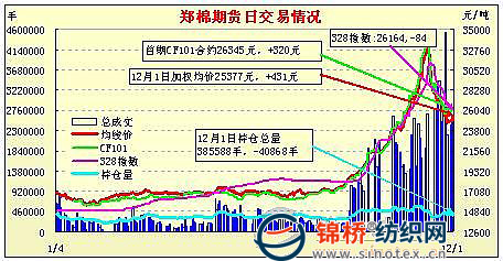 12月1日,鄭棉主要合約小幅低開,盤中在多空雙方減倉盤的作用下寬幅震蕩,午后多頭買盤推動期價沖擊日高,隨后短線平倉盤壓制期價回落,日線形成星線,日內(nèi)近月成交量萎縮,持倉量下滑。CF1105合約日成交239522手,日減倉12558手,終盤持倉量135328手;CF1109合約日成交1899224手,日增倉29692手,終盤持倉量216866手?;久媲闆r:籽棉收購仍較為冷清,棉農(nóng)存棉停售。價格下跌到4.8-5.5元/斤不等,部分廠家少量收購,勉強維持生產(chǎn),多數(shù)廠家仍堅持觀望。棉籽價格連續(xù)下跌,加工廠成本上升。