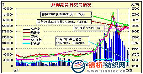12月29日,鄭棉CF1109合約小幅低開,早盤在空頭打壓下走低,盤中低位換手量較大,隨后在空頭集中回補(bǔ)的推動(dòng)下脫離低點(diǎn)迅速拉高,日線形成長(zhǎng)下影線的星線,日內(nèi)成交量放大,持倉(cāng)量增加。CF1105合約日成交34734手,日增倉(cāng)2222手,終盤持倉(cāng)量59222手;CF1109合約日成交1021004手,日增倉(cāng)18738手,終盤持倉(cāng)量231856手。 基本面情況:隨著新年假期的臨近,下游更多的織布企業(yè)停機(jī)放假,棉紗市場(chǎng)上看,部分廠家棉紗滯銷,對(duì)于原料補(bǔ)庫(kù)都是走一步看一步較為謹(jǐn)慎。短期內(nèi)下游市場(chǎng)需求不旺,整個(gè)棉紡市場(chǎng)動(dòng)力不足,處于冰凍期。年底軋花廠資金壓力較大,尤其是一些集資的軋花廠,資金壓力更大;同樣紡織廠由于前期利潤(rùn)高企擴(kuò)大產(chǎn)能后,導(dǎo)致流動(dòng)資金減少,又要保證工人工資,因此低價(jià)銷售。