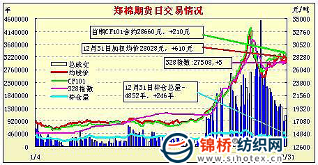 12月31日,鄭棉CF1109合約小幅低開,早盤在多頭買盤推動下沖高,此后區(qū)間震蕩,日線形成低開陽線,日內(nèi)成交量萎縮,持倉量下降。CF1105合約日成交24368手,日減倉3098手,終盤持倉量53844手;CF1109合約日成交728444手,日減倉2888手,終盤持倉量223612手?;久媲闆r:現(xiàn)貨市場價(jià)格平穩(wěn),成交低迷不改,市場將在這種氣氛中迎來2011。據(jù)中國棉花協(xié)會了解,2011年棉花進(jìn)口配額已經(jīng)發(fā)放至企業(yè),包括89.4萬噸進(jìn)口關(guān)稅配額和170萬噸滑準(zhǔn)稅配額。明年將視國內(nèi)外棉價(jià)走勢和新疆棉運(yùn)銷情況增發(fā)配額。從紗廠方面了解,目前價(jià)格基本穩(wěn)定,一些銷售好轉(zhuǎn)的企業(yè),棉紗價(jià)格還上調(diào)了幾百元,但也有一些資金緊張的企業(yè)繼續(xù)下調(diào)報(bào)價(jià),因?yàn)閹啄?a href='http://www.qdhqly.cn/News/Channel/?CID=31' title='更多棉花信息' target='_blank'>棉花價(jià)格偏高,占用企業(yè)資金量較大,而目前庫存又多,因此資金壓力比較大。