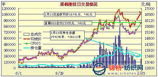 2月23日,鄭棉主要合約高開,CF1009合約早盤在多頭買盤推動(dòng)下沖高,隨后受到空頭賣盤打壓下滑,此后窄幅震蕩,日線形成1/2上影線的小陽線,日內(nèi)成交量變化不大,持倉量大幅增加。CF1005合約日成交19100手,日減倉2660手,終盤持倉量72334手;CF1009合約日成交140400手,日減倉23494手,終盤持倉量144724手?;久媲闆r:大多數(shù)紡企今日開始上班,采購價(jià)格仍然未調(diào)動(dòng),但是采購意向明顯增強(qiáng)。棉企及棉商銷售報(bào)價(jià)都有所上調(diào),3級(jí)棉提貨價(jià)普遍漲到15000元/噸,棉企觀望居多,成交稀少。
