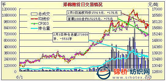 2月3日,鄭棉主要合約高開,CF1009合約早盤調(diào)整后在空頭回補(bǔ)的作用下回升,盤中區(qū)間震蕩,午后多頭集中買盤推動(dòng)期價(jià)走高,終盤收于日內(nèi)相對(duì)高位,日線形成小陽線,日內(nèi)成交量變化不大,近月持倉量減少,主力合約持倉量變化不大。CF1005合約日成交27520手,日減倉6568手,終盤持倉量100204手;CF1009合約日成交185656手,日增倉98手,終盤持倉量136544手。基本面情況:節(jié)前市場(chǎng)出貨意愿明顯增強(qiáng),紡織廠按兵不動(dòng),采購低迷,目前紡織廠已經(jīng)開始著手安排放假事宜;棉企目前分歧較大,囤棉風(fēng)險(xiǎn)日趨加大,實(shí)力較弱的小棉企開始選擇落袋為安,資金充足的大型企業(yè)依舊堅(jiān)定囤棉信心。目前冀、魯、豫、皖、贛幾省仍有少數(shù)棉廠堅(jiān)持收購加工,大部地區(qū)企業(yè)已經(jīng)停止收購。