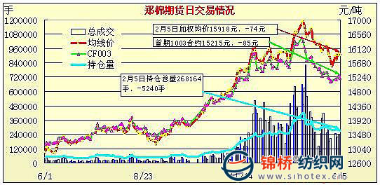 2月5日,鄭棉主要合約低開,CF1009合約早盤在空頭回補(bǔ)與多頭買盤的推動(dòng)下回升,此后區(qū)間盤整,尾盤在空頭回補(bǔ)的支撐下收強(qiáng),日線形成低開陽(yáng)線,日內(nèi)成交量萎縮,持倉(cāng)量減少。CF1005合約日成交15578手,日減倉(cāng)830手,終盤持倉(cāng)量91746手;CF1009合約日成交133156手,日增倉(cāng)4364手,終盤持倉(cāng)量139094手?;久媲闆r:現(xiàn)貨維持平穩(wěn),節(jié)前行情走弱。受紗、布市場(chǎng)疲軟影響,近期紡織企業(yè)陸續(xù)停產(chǎn)放假,受此影響棉花市場(chǎng)也“底氣不足”。存量不多的棉花企業(yè)都打算節(jié)前銷售,囤量較多的寄希望于春節(jié)后。大部分業(yè)內(nèi)人士認(rèn)為,春節(jié)后三、四月份將成為棉價(jià)再次上行時(shí)機(jī)。