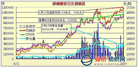 3月17日,鄭棉主要合約高開,CF1009合約早盤調(diào)整后換手回穩(wěn),午前在多頭買盤推動下上行,午后重心上移盤整,日線形成長下影線的陽線星,日內(nèi)成交量變化不大,持倉量繼續(xù)增加。CF1005合約日成交14748手,日減倉1400手,終盤持倉量47548手;CF1009合約日成交329330手,日增倉17248手,終盤持倉量238388手。相關(guān)市場情況:周二NYBOT棉花期貨回升。今日CNCE電子撮合交易成交16860噸,撮合高開高走,多頭推高動力不竭,MA各合同強(qiáng)勢上漲,成交量有所萎縮,訂貨量小幅減少。基本面情況:電子盤繼續(xù)上漲行情,撮合、期貨近期合約均價靠近,現(xiàn)貨價格繼續(xù)堅(jiān)挺上揚(yáng)。棉企報(bào)價連續(xù)上漲,下游紡企欲再提高紗線價格?,F(xiàn)貨報(bào)價普遍漲到16000元/噸,最高報(bào)價上升到16200元/噸。湖北地區(qū)由于今年棉花質(zhì)量較好,價格領(lǐng)高各地市場,目前已有部分湖北棉商前往河北等地調(diào)貨。