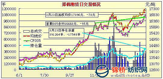 3月23日,鄭棉主要合約小幅高開,CF1009合約早盤橫向整理換手,隨后在多頭平倉的打壓下波段下滑,午后低位窄幅盤整,日線形成陰線,日內(nèi)成交量溫和放大,持倉量大幅減少。CF1005合約日成交14540手,日減倉1548手,終盤持倉量48308手;CF1009合約日成交262822手,日減倉19254手,終盤持倉量262822手?;久媲闆r:棉花現(xiàn)貨價(jià)格穩(wěn)中繼續(xù)上漲,部分棉商出貨意愿轉(zhuǎn)強(qiáng),成交有所增加。紡企預(yù)感棉花后期價(jià)格仍有攀高可能,購棉意愿也較前期增強(qiáng),在逐步補(bǔ)充庫存。下游棉紗銷售繼續(xù)走強(qiáng),尤其對(duì)配棉要求提高,大部分地產(chǎn)棉難達(dá)到要求,上下游互動(dòng)上漲的格局已經(jīng)形成。今日新疆棉二級(jí)內(nèi)地提貨價(jià)漲到16800元/噸,內(nèi)地三級(jí)棉提貨價(jià)在16200元/噸左右。高等級(jí)棉資源扔短缺,紡企購買較為困難,無存棉的中小紡企陷入觀望。