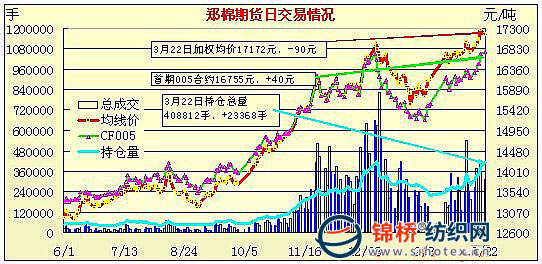 3月22日,鄭棉主要合約平開(kāi),CF1009合約早盤(pán)在多頭買(mǎi)盤(pán)推動(dòng)下增倉(cāng)上揚(yáng)觸及日高,隨后調(diào)整橫盤(pán),午后多頭主動(dòng)平倉(cāng)盤(pán)增加,打壓期價(jià)走低收弱,日線(xiàn)形成陰線(xiàn)星,日內(nèi)成交量萎縮,持倉(cāng)量先增后減。CF1005合約日成交11376手,日減倉(cāng)766手,終盤(pán)持倉(cāng)量49856手;CF1009合約日成交228118手,日減倉(cāng)4100手,終盤(pán)持倉(cāng)量262176手。基本面情況:各地現(xiàn)貨價(jià)格繼續(xù)上漲,但是成交冷清。地產(chǎn)正三級(jí)棉花市場(chǎng)報(bào)價(jià)較為混亂,可謂是坐地起價(jià),紡織廠(chǎng)不愿意承擔(dān)這么高的價(jià)格,所以陷入觀(guān)望。近期人民幣升值問(wèn)題被炒的火熱,紡織廠(chǎng)擔(dān)心人民幣升值,同時(shí)對(duì)于后期的訂單也有所擔(dān)憂(yōu),對(duì)當(dāng)前市場(chǎng)價(jià)格顯得較為謹(jǐn)慎。棉花企業(yè)面對(duì)當(dāng)前的上漲局勢(shì),一些企業(yè)開(kāi)始陸續(xù)出手,但是也有一些企業(yè)繼續(xù)看高,并期望于7、8月份。