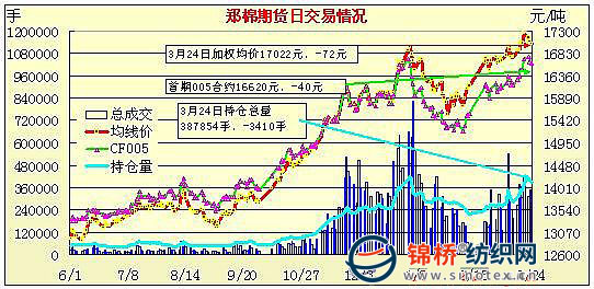 3月24日,鄭棉主要合約小幅高開,CF1009合約早盤受到平倉盤打壓下滑,此后在空頭回補與多頭買盤的支撐下反抽,此后區(qū)間震蕩,午后多頭平倉盤再涌,期價隨之下滑,尾盤在空頭短線獲利回補的支撐下反彈,日線形成陰線,日內成交量萎縮,持倉量繼續(xù)減少。CF1005合約日成交8130手,日減倉912手,終盤持倉量47388手;CF1009合約日成交208564手,日減倉9016手,終盤持倉量233906手?;久媲闆r:內地棉三級成交價在16500元/噸左右,不三不四棉花提貨價在16000元/噸,新疆兵團棉花報價已到17000元/噸。對于當前價格紡紗廠多表示可以接受,但采購量均不大,多是隨用隨買。另據(jù)了解,從今日開始新疆棉運輸車皮開始增加,從之前的140個車皮/日,增加到200個車皮/日左右。但預計運輸恢復到正常水平還需要半個月左右。