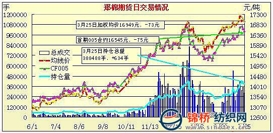 3月25日,鄭棉主要合約低開(kāi),CF1009合約早盤調(diào)整后在多頭買盤支撐下回升,午前測(cè)試日高,午后在平倉(cāng)盤壓力下回落,日線形成陽(yáng)線星,日內(nèi)成交量萎縮,持倉(cāng)量先增后減。CF1005合約日成交6398手,日減倉(cāng)1006手,終盤持倉(cāng)量46366手;CF1009合約日成交168854手,日減倉(cāng)328手,終盤持倉(cāng)量233578手。基本面情況:現(xiàn)貨報(bào)價(jià)上調(diào),下游紡織企業(yè)紗線價(jià)格繼續(xù)上揚(yáng),純棉紗俏銷,給上游棉花價(jià)格有利支撐。內(nèi)地棉現(xiàn)貨三級(jí)提貨價(jià)普遍上漲到16500元/噸,紡企基本能夠接受,成交增多。部分棉商繼續(xù)看漲后市,打算等到四月底再銷售。紡織企業(yè)庫(kù)存維持較低水平,大部分企業(yè)庫(kù)存只有一個(gè)月左右,開(kāi)始四處尋棉。近期,棉籽價(jià)格下跌較快,由原來(lái)的1.45-1.5元/斤,普遍下跌到0.35-0.4元/斤。受皮棉銷售利潤(rùn)可觀影響,河北、山東地區(qū)棉企積極收購(gòu),并調(diào)高了籽棉收購(gòu)價(jià)格,河北威縣地區(qū)某棉日收購(gòu)量能達(dá)到12萬(wàn)左右。