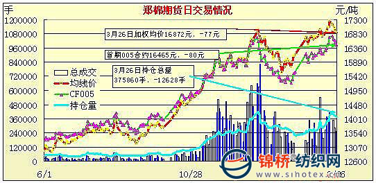 3月26日,鄭棉主要合約低開,CF1009合約早盤在恐慌性平倉盤打壓下調整,隨后多頭買盤與空頭回補支撐期價回升,盤中區(qū)間震蕩,午后增量走低,尾盤在周末獲利回補的支撐下反彈,日線形成陰線星,日內成交量放大,持倉量減少。CF1005合約日成交8872手,日減倉1664手,終盤持倉量44262手;CF1009合約日成交209824手,日減倉8112手,終盤持倉量225466手。 相關市場情況:周四NYBOT棉花期貨受農產品版塊下跌拖累收低。今日CNCE電子撮合交易成交23020噸,撮合繼續(xù)低開,盤中一度回落到16800線上下,盤尾有所回升,MA各月合同近強遠弱,成交繼續(xù)放大,訂貨量有所減少。基本面情況:現貨市場報價略有穩(wěn)定,但標準級棉花仍稀缺,價格有繼續(xù)上漲趨勢。部分囤棉棉商繼續(xù)看好后市,現貨最高價看到18000元/噸。紡織廠紗線銷售繼續(xù)走好,仍是按訂單購買棉花,中小紡企對棉花價格接受能力減弱,有部分停產現象。籽棉收購以河北、山東為主,棉企抓緊搶收,價格有所上調。