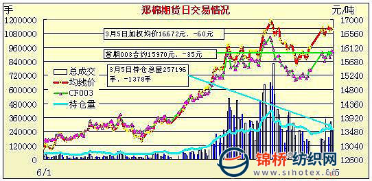 3月5日,鄭棉主要合約小幅低開,CF1009合約早盤多頭買盤推動期價沖高,隨后平倉盤壓制期價滯漲盤整,午后多頭買盤再涌,交投重心小幅上移,日線形成小陽線,日內(nèi)成交量萎縮,持倉量減少。CF1005合約日成交7096手,日減倉1388手,終盤持倉量59220手;CF1009合約日成交147576手,日減倉2296手,終盤持倉量147576手?;久媲闆r:山東某大型紡企也上調(diào)了現(xiàn)貨采購價格,但此價位低于大部分棉商報(bào)價。近期電子盤連續(xù)大漲,帶動外棉、內(nèi)地棉不斷上調(diào)價格。由于新疆棉大量未運(yùn)到內(nèi)地,導(dǎo)致內(nèi)地高等級棉短缺,大部分企業(yè)更看漲后市。紡織企業(yè)擔(dān)心后期購買高等級棉困難及價格再漲,目前采購量有所增加。