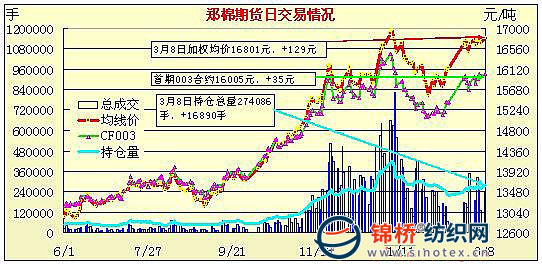 3月8日,鄭棉主要合約小幅高開,CF1009合約早盤調(diào)整后低位放量回升,觸及日高后在空頭賣盤與多頭平倉的壓制下回落盤跌,日線形成陽線星,日內(nèi)成交量放大,持倉量增加。CF1005合約日成交14048手,日減倉2198手,終盤持倉量57022手;CF1009合約日成交213700手,日增倉13270手,終盤持倉量160846手?;久媲闆r:近期,現(xiàn)貨皮棉價(jià)格持續(xù)上調(diào),紡織企業(yè)紗線銷售較為理想,提貨采購原料的企業(yè)增多。棉商依然惜售,而且市場上可選擇的高等級(jí)棉比較有限,棉企囤棉惜售,成交仍稀少。日前,山東武城、河北威縣仍有棉企在進(jìn)行收購,今日籽棉價(jià)有所上調(diào),但收購量很小。