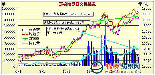 4月2日,鄭棉主要合約高開,CF1009合約早盤在多頭買盤推動下走高,此后形成平盤整理,盤中空頭回補支撐盤面,尾盤在周末空頭集中回補的推動下收強,日線形成高開陽線,日內成交量變化不大,持倉量略有減少。CF1005合約日成交4134手,日減倉1936手,終盤持倉量36008手;CF1009合約日成交138918手,日增倉1602手,終盤持倉量194576手?;久媲闆r:現(xiàn)貨價格三級穩(wěn)定在16400-16500元/噸,弱三級在16000-16200元/噸,四級在15700-15900元/噸左右.購銷雙方觀望較濃,部分棉花企業(yè)看漲6月行情。紡企對5月份接單較為憂慮,采購棉花熱情下降。受今年棉花種植面積基本與去年持平影響,大部分棉花企業(yè)看好下年度棉花價格,欲新年度增加棉花收購力度。
